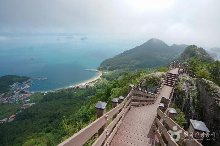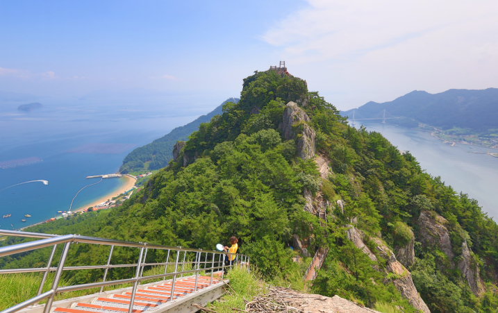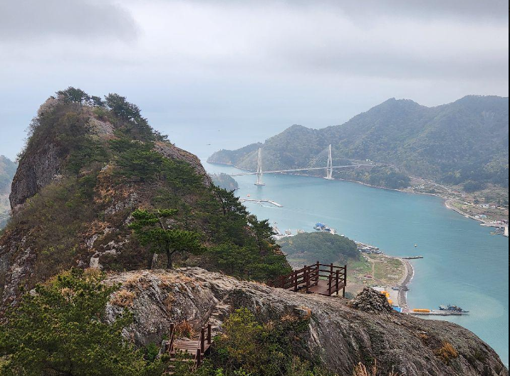 짧지만 바람에 강하게 흔들리며 등산객에게 압도적인 스릴을 제공한다. 한 번도 아닌 두 번 이어지는 다리 구조는 긴장감을 더욱 고조시키며, 단순한 산행을 짜릿한 어드벤처로 탈바꿈시킨다. 출렁다리 위에서는 탁 트인 남해의 바다, 점점이 흩어진 섬들, 그리고 사량대교의 조망까지 한눈에 담을 수 있어 사진 촬영 장소로도 인기다.